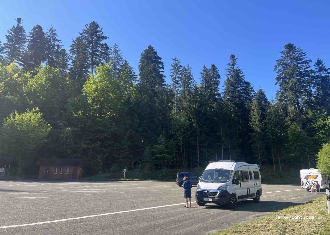 Parking N4 près du lac, WC, vidange eau grise et noire, pas d'eau clair, calme dans les montagnes, baignade, tour du lac en vélo ou à pied, restaurant à 500 m, super endroit.