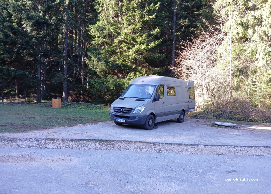 Very nice place in the bend next to the road but very quiet. With shade in this period it is appreciated, there is even a small fresh stream. Rather flat and partly concrete, the locals come there for their picnic. Very pleasant !