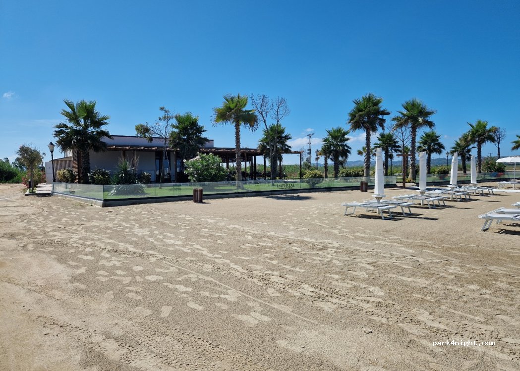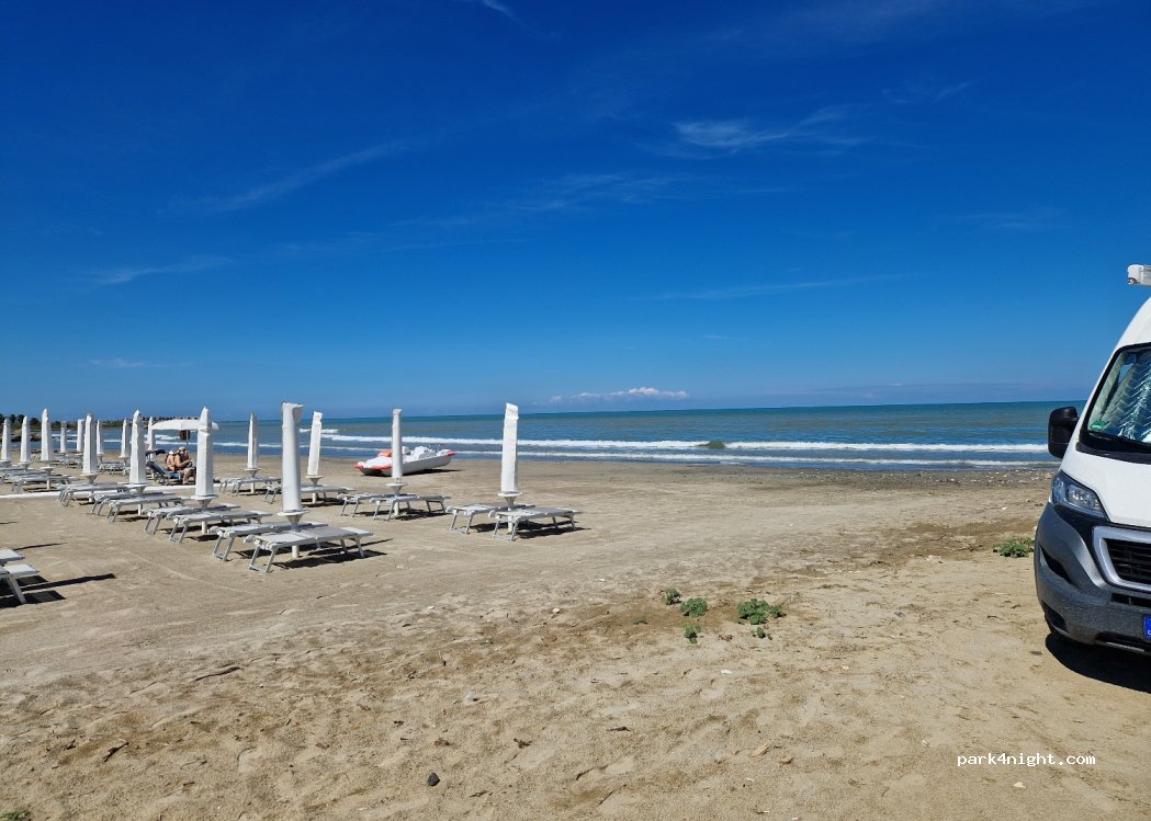 We parked on the beach by the restaurant. Arrived late (about 22:00) place just closed. We paid 10EUR for stay. Toilets/beach shower available, security guard at the restaurant whole night.