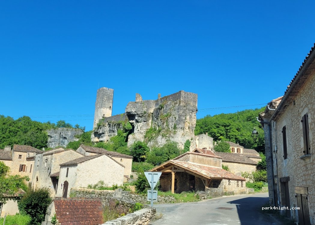 Very flat car park for a meal stop at the foot of Gavaudun castle. No prohibition therefore night possible but at the roadside.