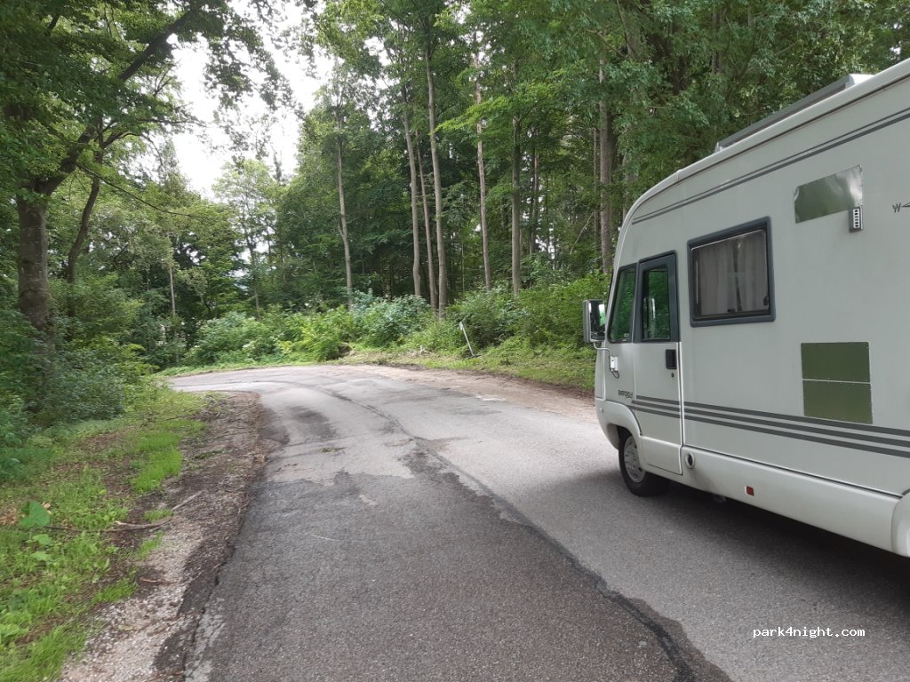 Nice parking lot for hikers a bit off a small road in the forest. Very quiet and suitable for overnight stays. Small chapel in the forest.