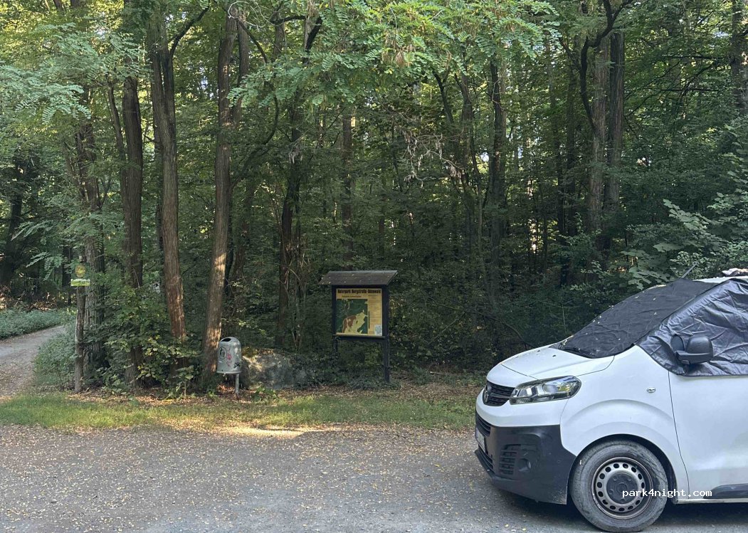 Simple forest car park, very quiet with a few short hiking trails for a longer break.