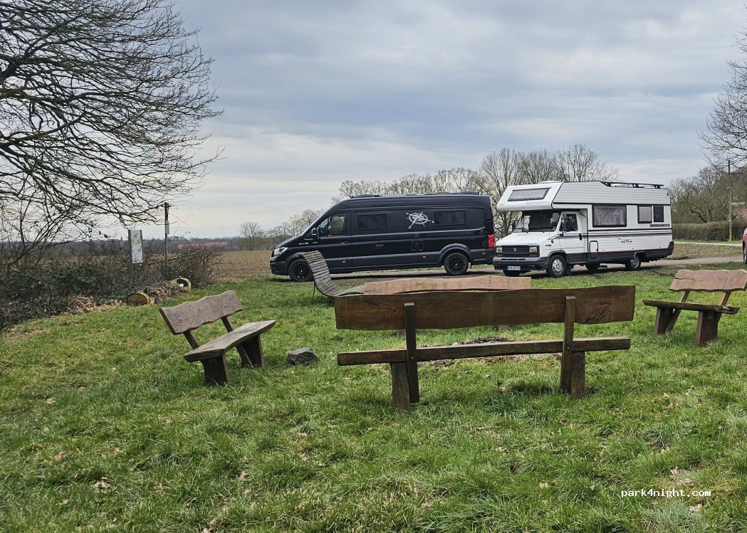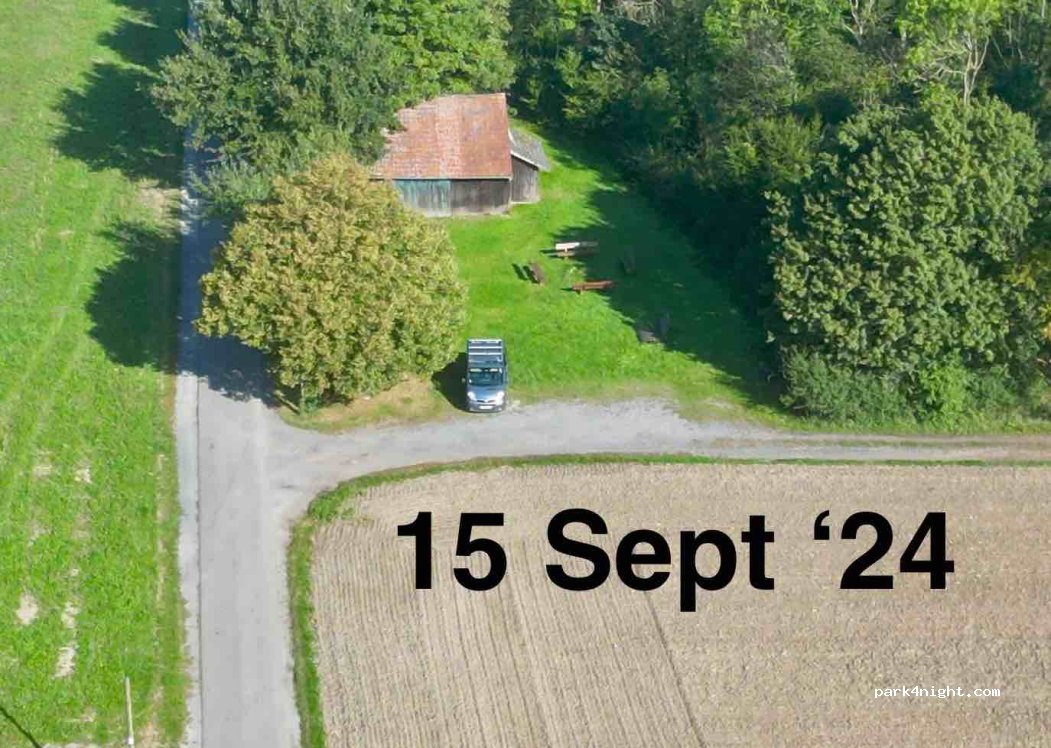 A beautiful spot in the middle of the countryside. The nearby road mostly travelled by bicycle and foot. A small flat spot will best accommodate small <6m vans parked perpendicular to allow for other cars. Plenty of wooden seating, one table and a bin provide all the services you need. Saturday night, I stood alone with no problems.