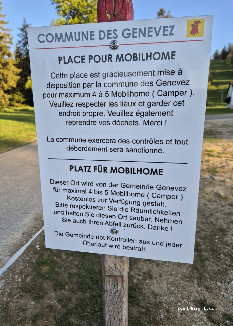 Offizieller Bescheid der Gemeinde: Bonjour, En effet, durant la saison d’été nous séparons le parking du téléski en deux espaces. Un pour les utilisateurs de la buvette et l’autre pour les camping-cars. L’espace pour les camping-cars est utilisable librement. Pour autant que les gens laissent cet espace propre et sans déchets. Merci de votre attention et meilleures salutations.
