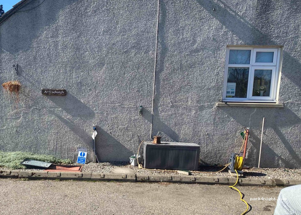 Absolutely lovely owners, we called about 9pm (there is an advert and mobile number at the entrance to their street Ar-Dachaigh Croft Campers), no answer but she called back and we moved the camper van to their drive about 10pm! All waste facilities and fresh water available. Playground and public toilets over the road and shops nearby. Great spot all clearly set up for 3 camper vans.