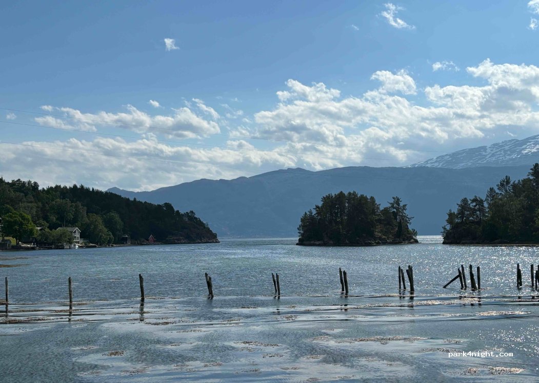 Un site effectivement bien agréable, grand parking arboré qui donne de deux côtés sur le fjord. Vues superbes. Un bémol : une odeur désagréable (mais naturelle je pense) près de l'eau.