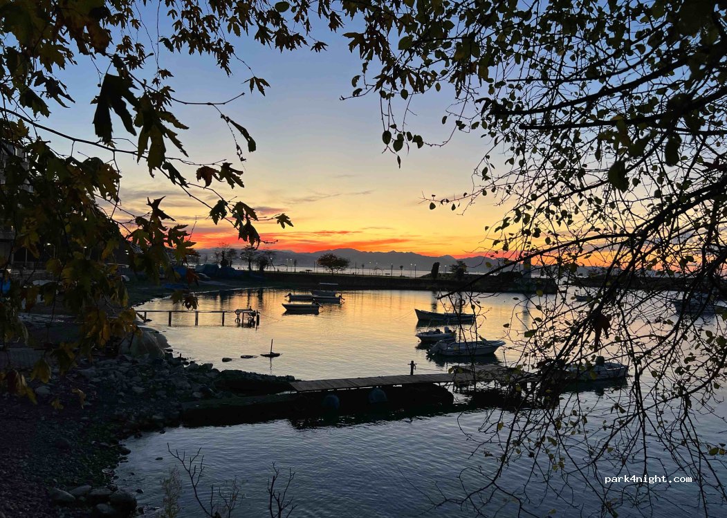 Aparcamiento sombreado y arbolado en el puerto con parque infantil y merendero. Una playa para bañarse está a 100 metros de distancia. Muy tranquilo aunque está cerca de un pequeño pueblo. Bonita vista sobre el mar hasta la ciudad de Fatsa.