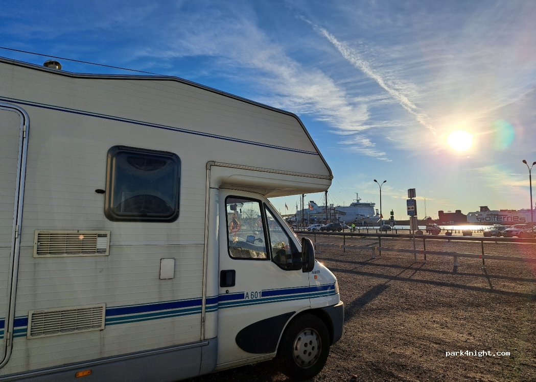 Nu finns inte längre skylten som anger att det är husbilsparkering, men vi har stått här i 2 dygn för 44 kr/dygnet. Betals med apparna. På kvällarna hör man motorerna från färjorna men efter 23 är det tyst o lugnt. Finns bajamajor o container för sopor vid stora runda cisternen.