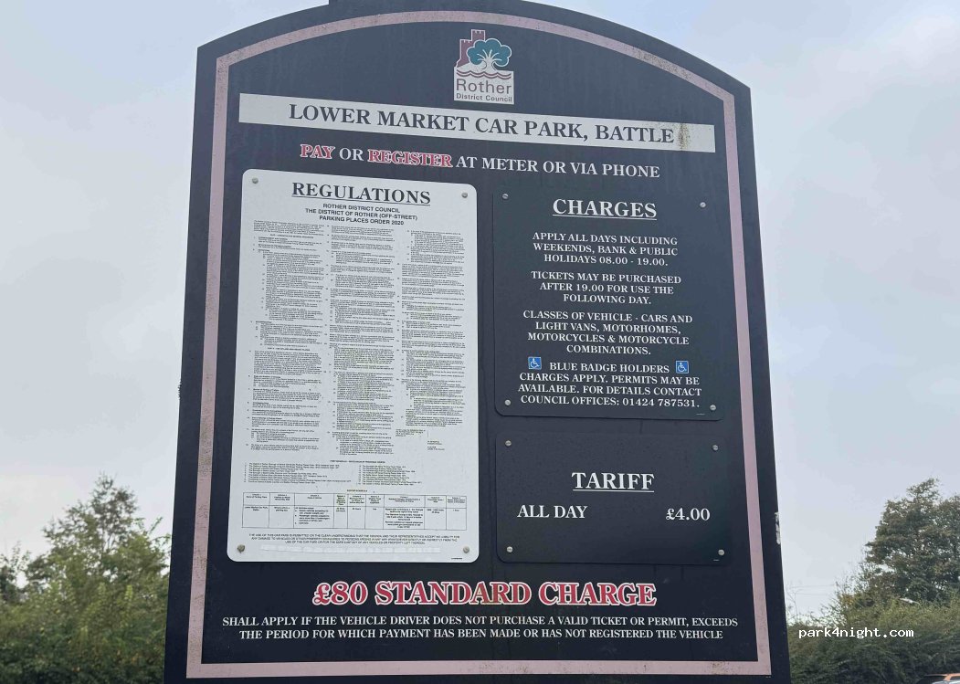 Day parking in Battle. The first car park has a height barrier, the second is barrier-free. The bays at the end of the parking lot near the school allow for an overhang on the way.