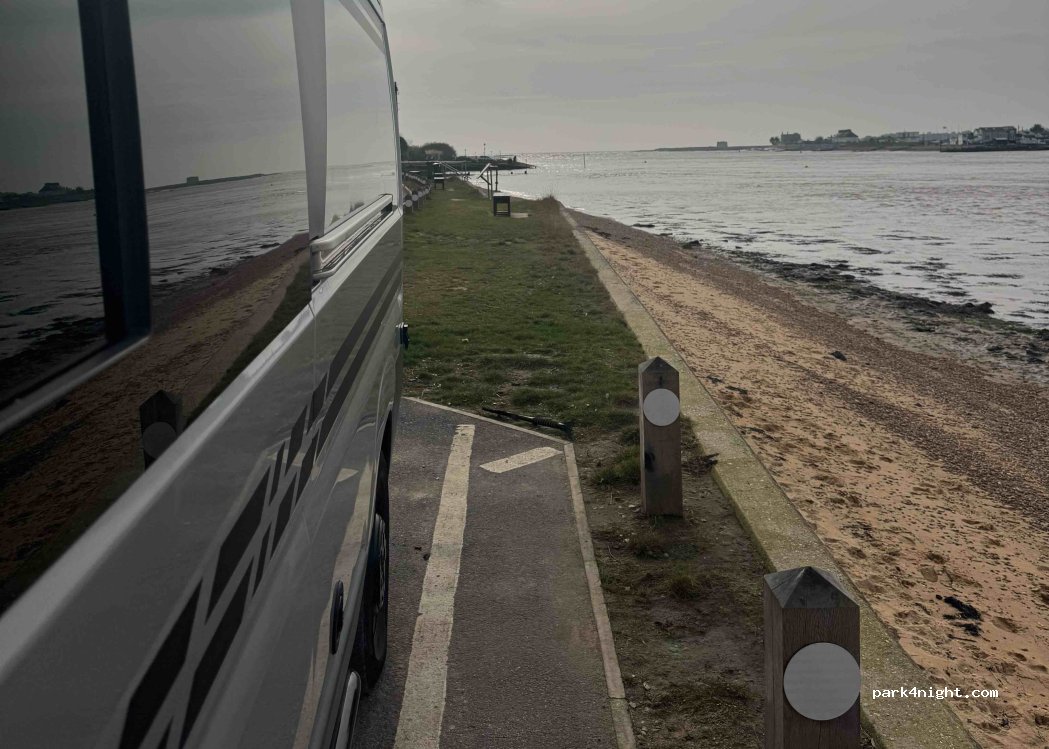 Beautiful spot to spend a while on the small beach watch the boats and enjoying the sun set. park at the road side so there is passing traffic and it can get busy. lovely cafe and foot ferry to other side of estuary. Council have placed bollards to limit parking by silly people who stay for days on end. We use this a lot but I wouldn’t stay overnight. It’s a public road and the police do patrol.
