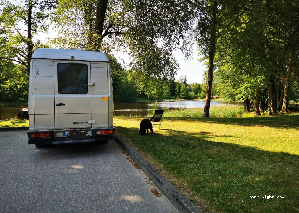 Parkplatz ruhig. Es gibt einen Grillplatz und Tische. Im Weiher kann man schwimmen. Container vorhanden.