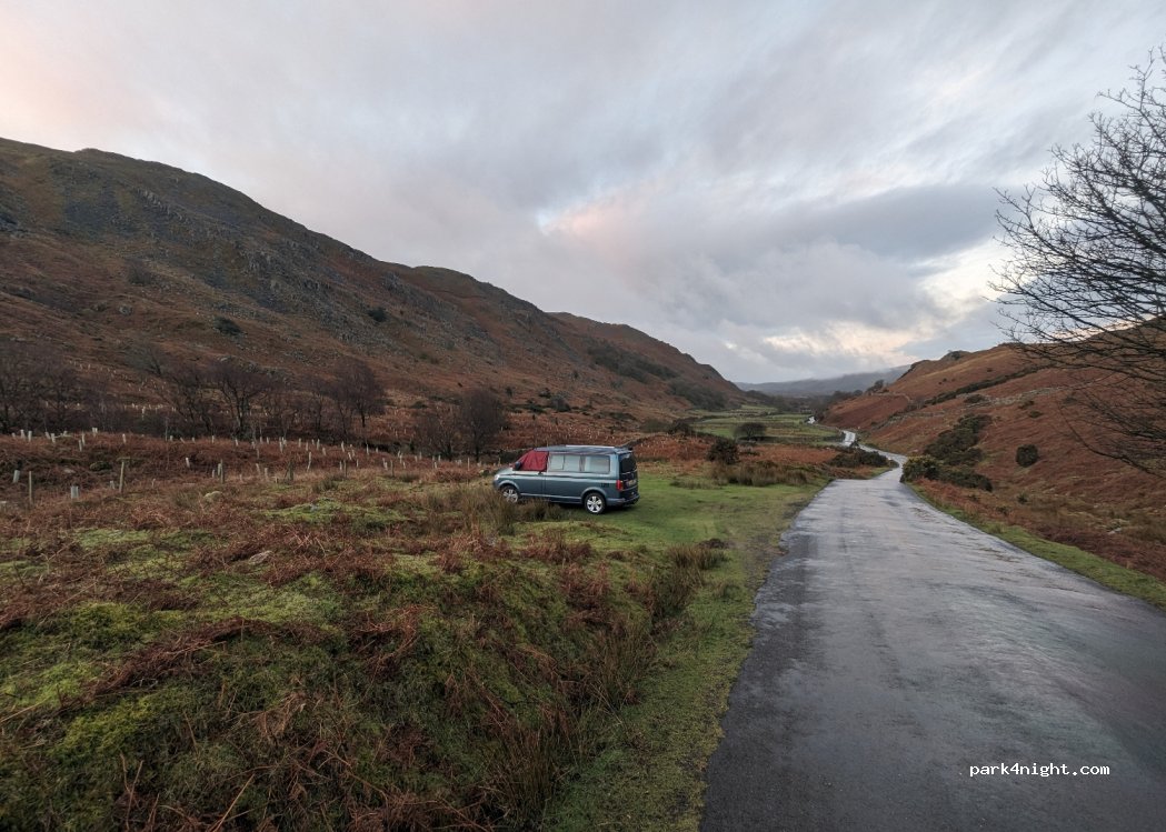 Cracking spot on the climb out of Eskdale Green heading towards Ulpha by Red Gill. It’s a grassed largish lay-by on the right hand side as you go up the hill and it’s flat. Awesome views and only the odd car as it gets later. Brilliant spot for an overnight stay and there’s phone reception.