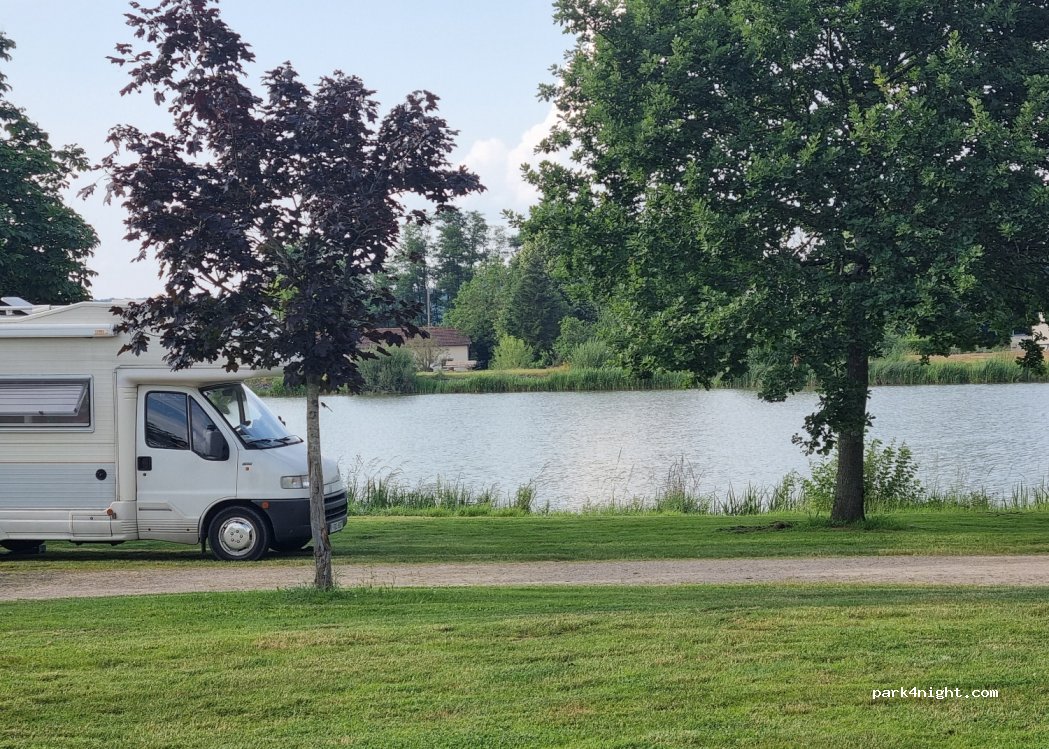 Vor dem See Parkplatz auf Gras. Herrlicher Blick zum See und absolute Ruhe. Wenn der Untergrund zu matschig ist, kann man auf der gegenüberliegenden Seite des See ca. 150 m nach der Pension stehen. Im Sommer am Besten gegen Abend anfahren um den einheimischen Badegästen nicht die Parkplätze zu belegen. 800 m im Ort gibt es frisches Baguettes zum Frühstück.