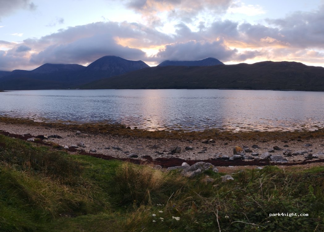 Stayed overnight in the layby. Beautiful views. Road is busy during the day but pretty quiet at night. Managed to find somewhere level. Next to a small beach so had somewhere to walk our dog. Good 4G on EE.