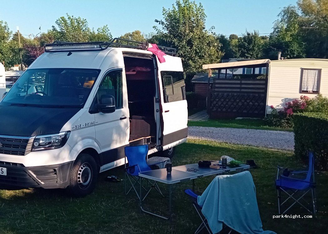 What we really liked about this campsite was how clean the facilities were. Dropped a star for us because push button shower and short reception opening times but it didn’t really matter. We got in at 19.30hrs, found a spot and set up. The office opened from 8.45am - 9.15am and we bought tokens for the shower. The office is then open at 6pm - 6.30pm. Very quiet spot, friendly and helpful staff and a fab bakery about 5 mins drive away! We would come back next time we use Le Shuttle - so convenient!