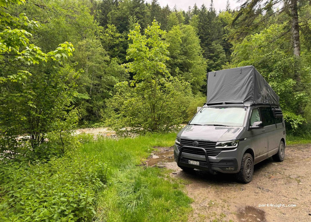 War etwas matschig. Haben aber eine tolle und ruhige Nacht verbracht. Tagsüber sind viele Leute im Wald unterwegs und manchmal fährt ein Auto vorbei. Es hat sich jedoch niemand an uns gestört.