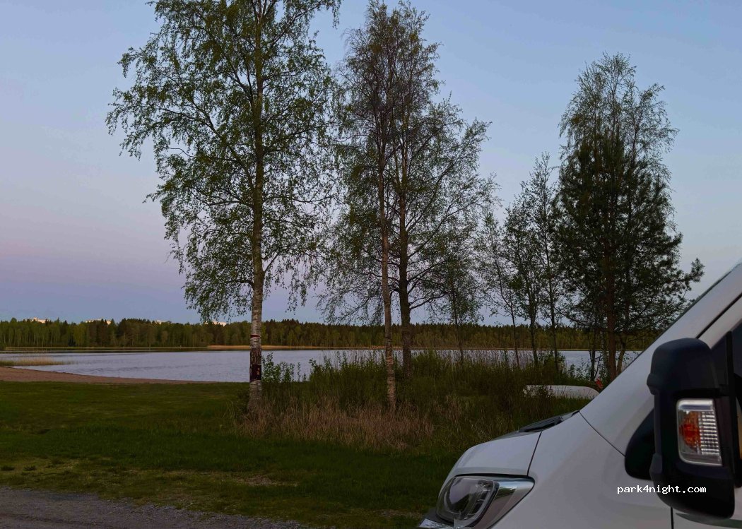 Buen lugar para pasar la noche. Muy tranquilo. Es un parquing de grava con capacidad para 5-10 autocaravanas o camper, dependiendo de como se aparque. Facil acceso, a 5 minutos de la carretera principal que lleva a Rovaniemi. Tiene una playa para que jueguen los niños y el agua del lago aunque fria merece la pena para pegarse un baño.
