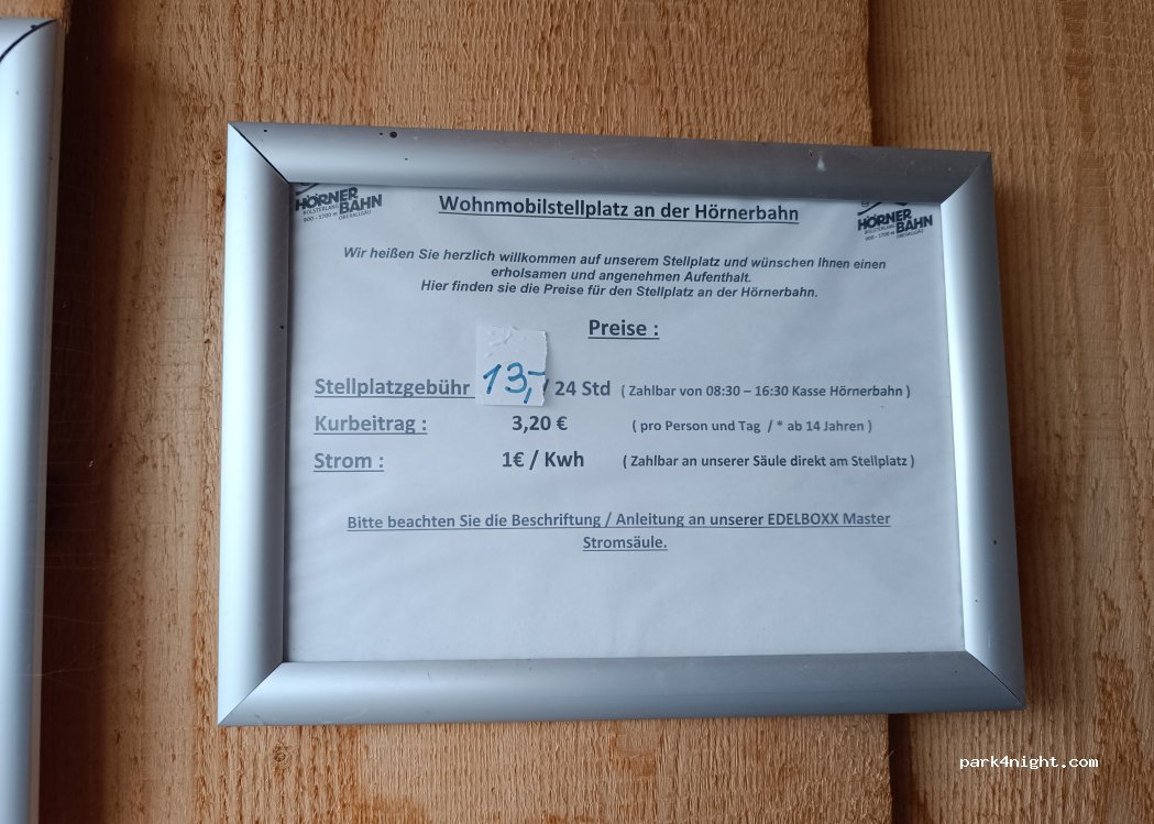 Super Stellplatz mit tollem Ausblick.Gebühr für 2Erwachsene/1Kind 16,50Euro.Bezahlung während der Öffnungszeiten der Hörnerbahn,sowie Toiletten.Ver-und Entsorgung möglich.Strom für 1€/kWh vorhanden.Automat mit Snack/alkoholfreien Getränken da.Grillen erlaubt.Sehr gerne wieder.