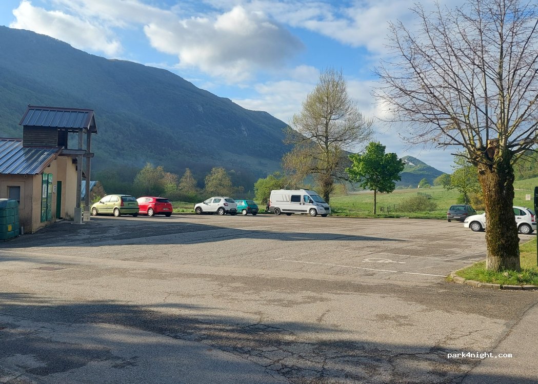 Bien sûr, ça reste un parking peu ombragé et en bord de route. Cependant, les sanitaires (WC/lavabos) sont vraiment impeccables, la paysage est agréable. Départ de rando vers le Grand Echaillon, petit resto ouvert 7/7 de 9h à 18h, abbaye très jolie. Pour une nuit, c'est très bien.