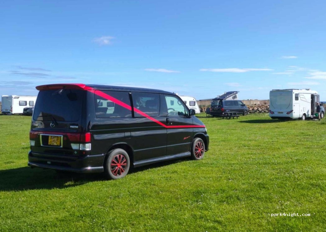 Einfacher Platz auf Rasen mit Meerblick für 10 £.Strom ist optional, Entsorgung für WC und ein Klo gibt es auch wer‘s braucht ;-) leider riecht es an der Bucht recht streng nach Meer bzw. modrig (?) je nach Windrichtung.