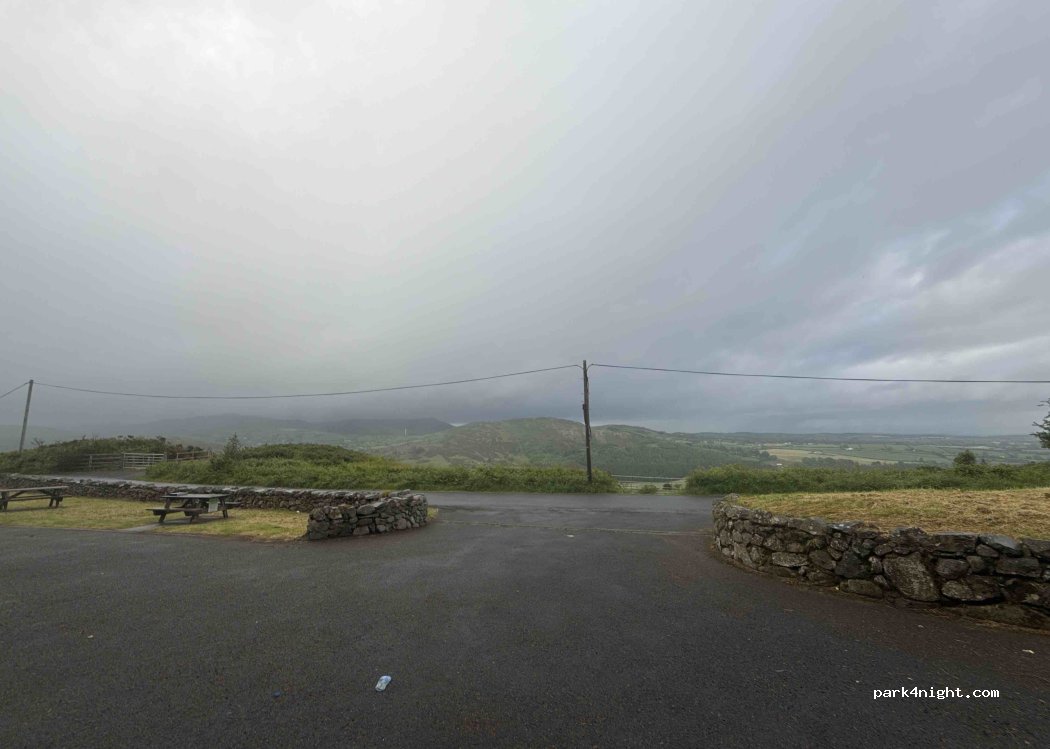 Small carpark just off a quite road with nice views of Slieve Croob. 4g reception on Vodafone, very slightly sloping park up, with bins, no water or toilets, no height restriction.