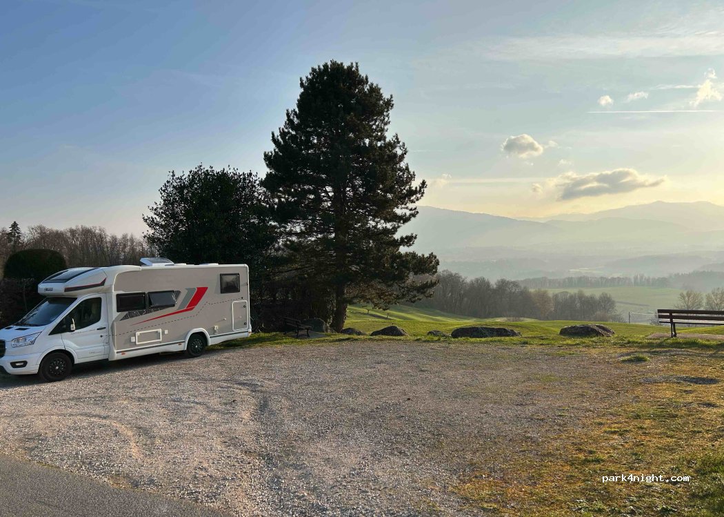 Free parking point (day and night). With a view of the valley, on site you will find two benches and a trash can, below you will also find a golf course and a little more above a mini skate park. Place located next to a cemetery.