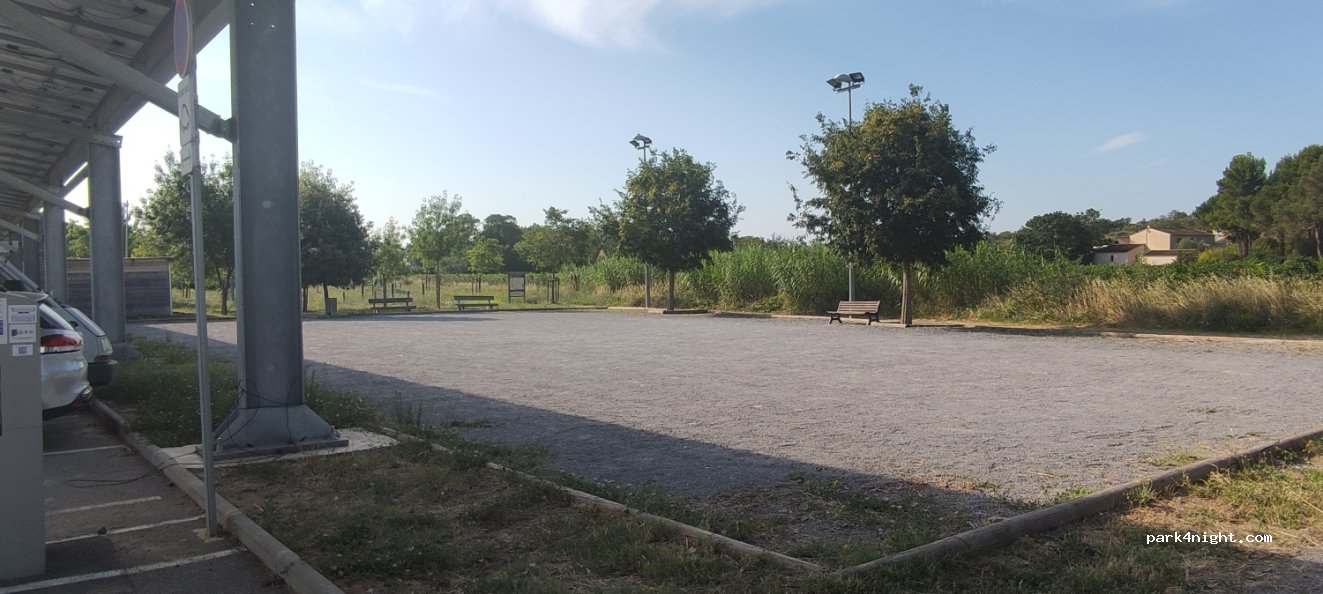 C'est un parking avec une ombriere de panneaux photovoltaiques. Très agréable de trouver de l'ombre avec ces chaleurs. En plus il y a un robinet d'eau, un parc, des bancs. Calme. Merci la commune.