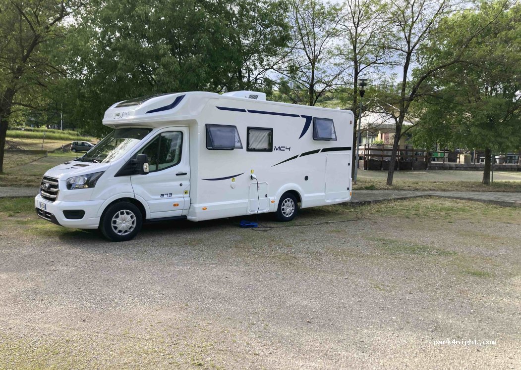 Très bon lieux de parking, calme, propre et suffisant pour une nuit ou deux. Électricité disponible. Peu cher. Aire de jeux enfants. Pas de sanitaires malheureusement. A 15 mn à vélo du centre de Maranello par un sentier le long de la rivière qui évite la route à fort trafic. Trattoria Zanichelli très sympa. Plats locaux, simple et bon marché. Je recommande. Route à 100m sonore comme la rivière…
