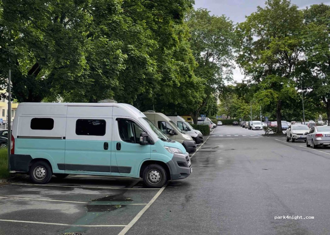 Stod här från 14-tiden på lördagen till ca 9 på söndagen och fick betala 95kr. Gott om plats, flera andra campervans i närheten och väldigt lugnt. Kändes tryggt. Lite trafikljud men inget som störde. Enkelt att betala i appen ePark och ca 3km promenad in till centrum. Finns också flera caféer och butiker i närheten.