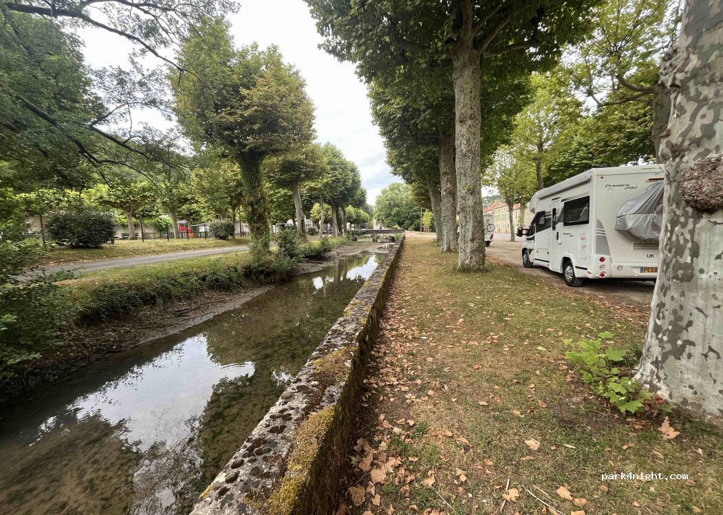 Pulled in here on a whim as tired of driving. Great stop. Free emptying and fresh water fill. Very peaceful night next to the river under huge plane trees. Seems like a lovely, living and working French town. Added bonus - the pizza takeaway was open on the Sunday evening we were there!