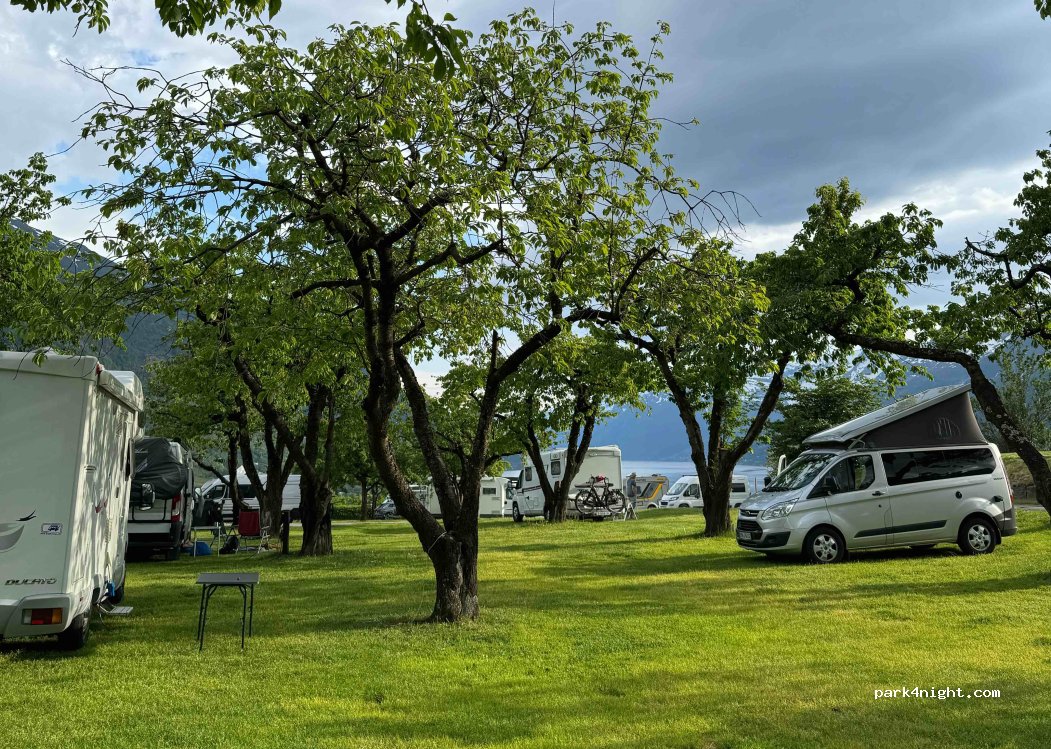 Toller kleiner Platz inmitten Obstplantagen. Haben 445 NOK gezahlt (Platz 300 NOK für 2 Personen und 6 Meter Wohnmobil, 125 NOK Strom und je 10 NOK Dusche). Alle Servicemöglichkeiten vorhanden, guter Ausgangspunkt für Wanderungen (z.B. Nosi). Freundliches Personal, wir durften am Abreisetag noch bis 14 Uhr stehen bleiben. Bei Anreise gegen 16 Uhr vieles frei, abends aber fast alles belegt.