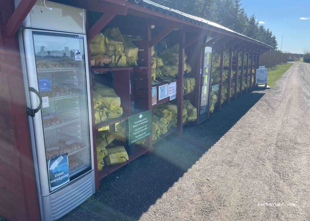 Terrain plat et herbeux situé proche de la route pouvant accueillir jusqu'à une vingtaine de CC. Nuit calme. Fruits et légumes en vente à l'entrée en libre service. Oeufs déposés le lendemain au pied de notre CC. Emplacement avec WC 100DKK, douche 10 et électricité 45 DKK. Sanitaires un peu vieillots, propres selon l'affluence. Évier pour la vaisselle et tables en bois à disposition à l'extérieur