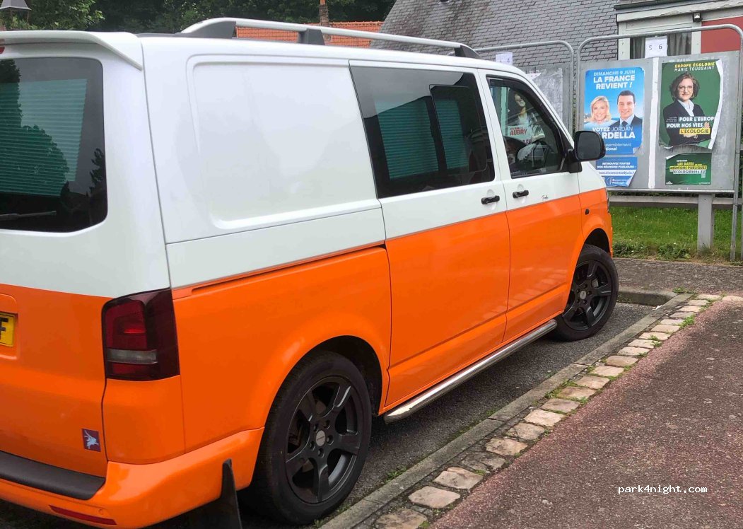 Fait le job pour passer une nuit avant ou après le ferry. Sans plus. Pas de bruit. En revanche packs de bière à côté de la poubelle... pas bon signe. C'est le parking d'une salle municipale, donc éventuellement complet certains soirs.