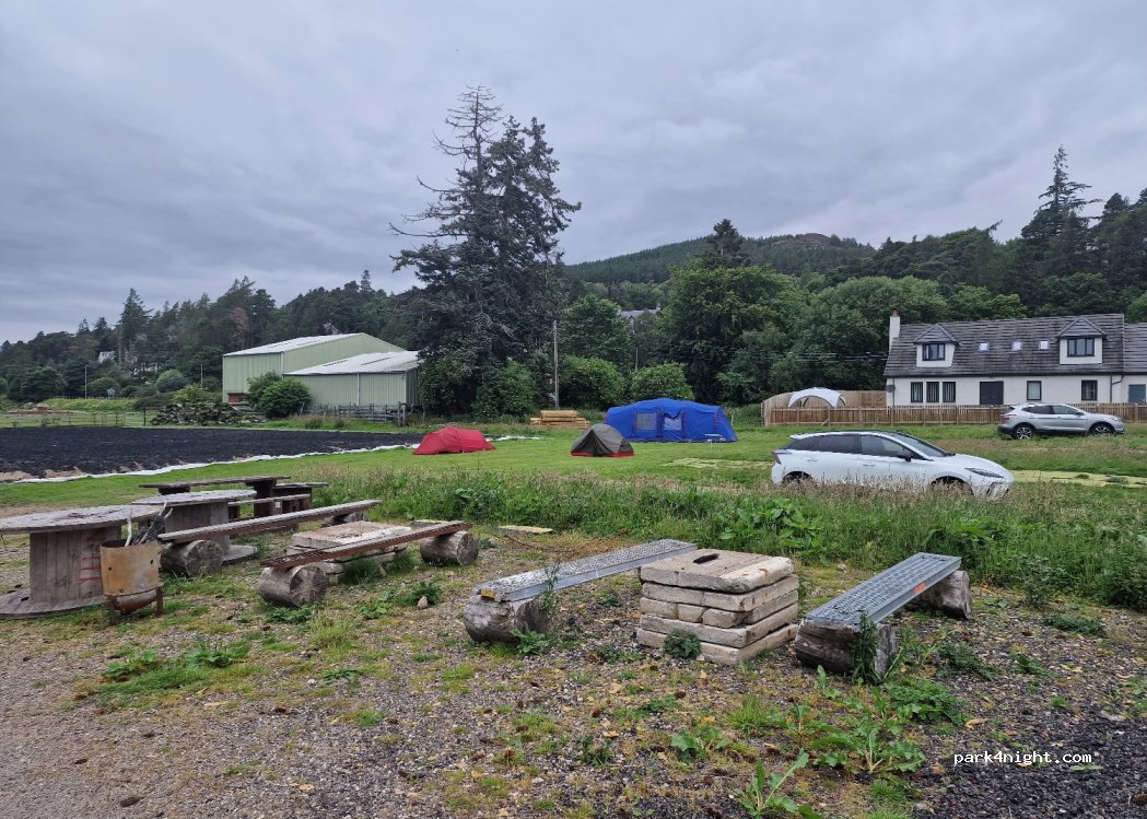 Nice place with view on the fields, ponies and horses. The other side of the view is an electricity plant but it does not bother if you park facing away, or simply ignore it... It is a farm with nice people and many horses. Not perfect but authentic and worths its 10 £. Close to the village, laundry close by, cool mountain-biking - refer to the “badenoch” app for tours (super cool!)