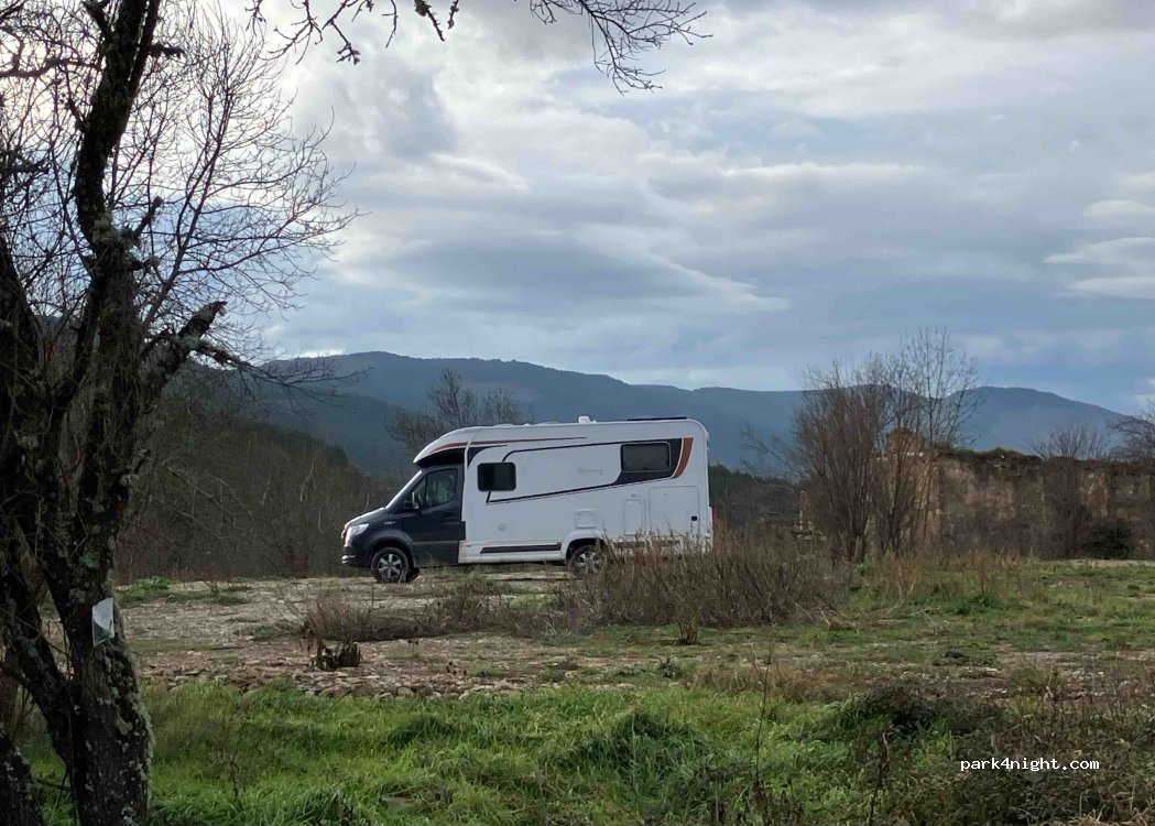 Spot sensationnel, oiseaux, nature, calme. Installer pour la nuit sur l'herbe juste au dessus du parking. La guarda civile passe et aucuns problèmes. Par contre, impossible de visiter le village abandonné, il est encerclé de barrières.