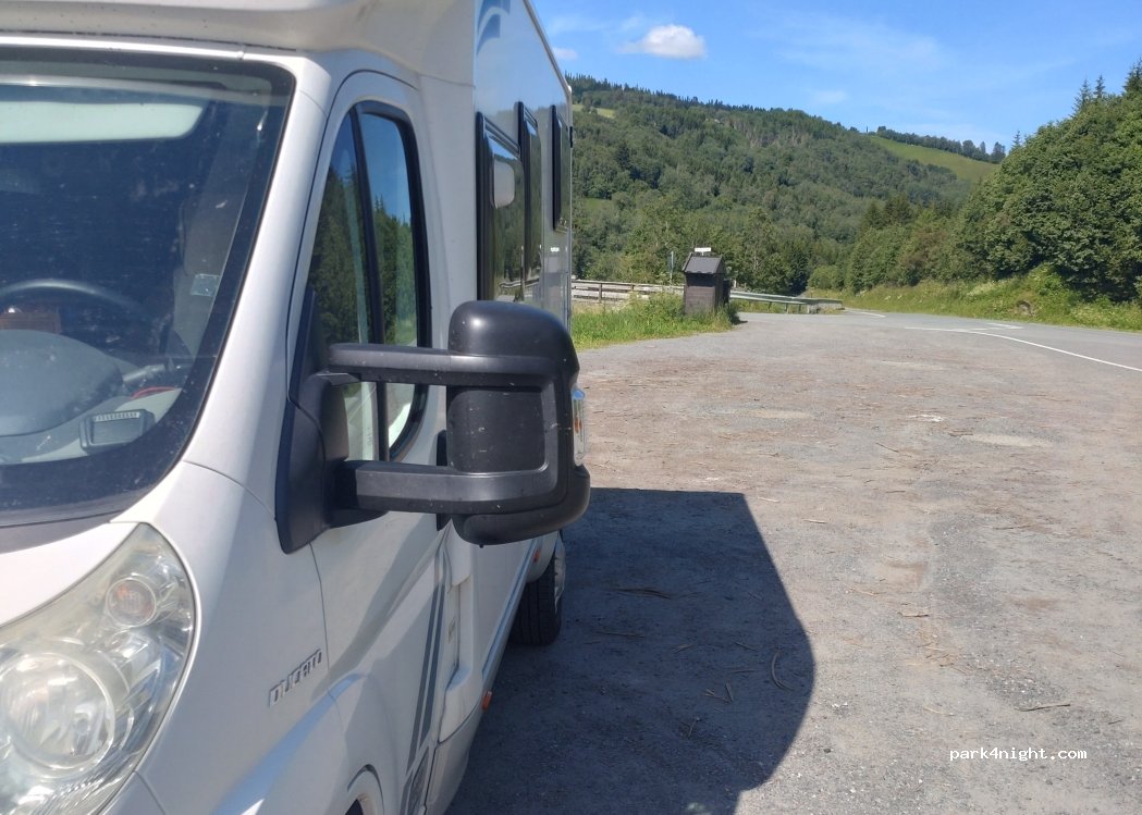 Ganz einfache Parkfläche neben einer recht ruhigen Straße nichts spektakuläres. Für eine Nacht ganz ok. Fläche ist nur an ein paar Stellen nahe zu eben. Wir standen mit einem anderen Camper dort und konnen uns gut positionieren. Fluss ist hörbar aber dies hat uns nicht sonderlich gestört. Da waren die zu schnellen Autos störender (2-3 die Nacht)