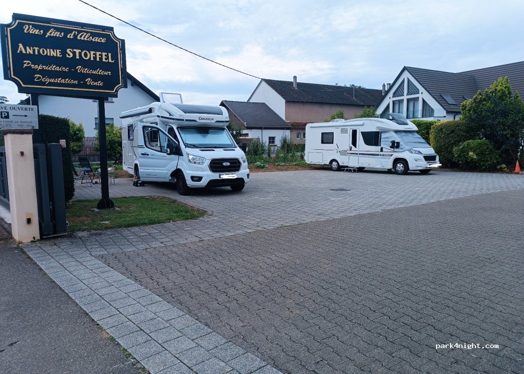 Nous avons passé deux nuits chez le viticulteur. Très accueillant et sympathique. Donnez un petit coup de file avant de vous rendre sur place car il n'y a que 4 places (parfait). Eau et électricité sans problème et à un tout petit prix (5€). Nous avons gouté à de très bon vins bio et jus de raisin que nous même ramener avec nous. Nous reviendrons et encore merci à la maison Antoine STOFFEL.