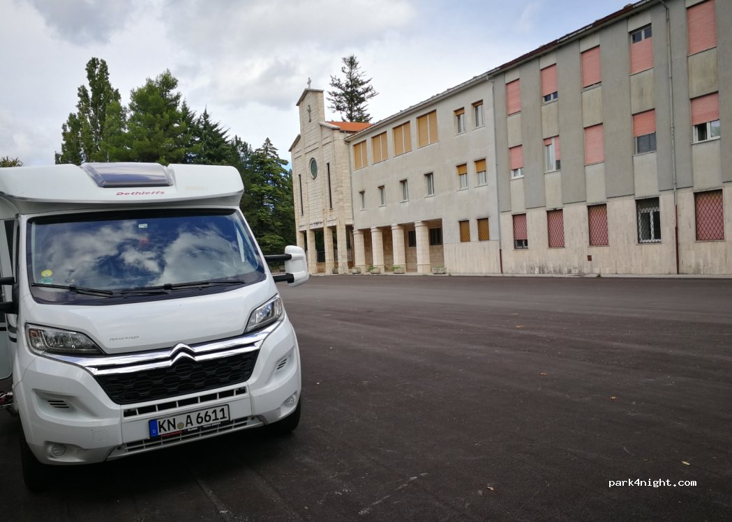 Abbiamo dormito una notte in questo spiazzo dietro il convento (chiuso). Posto molto tranquillo a 10 minuti a piedi dal paese. Confermiamo la presenza della fontana con acqua freschissima.