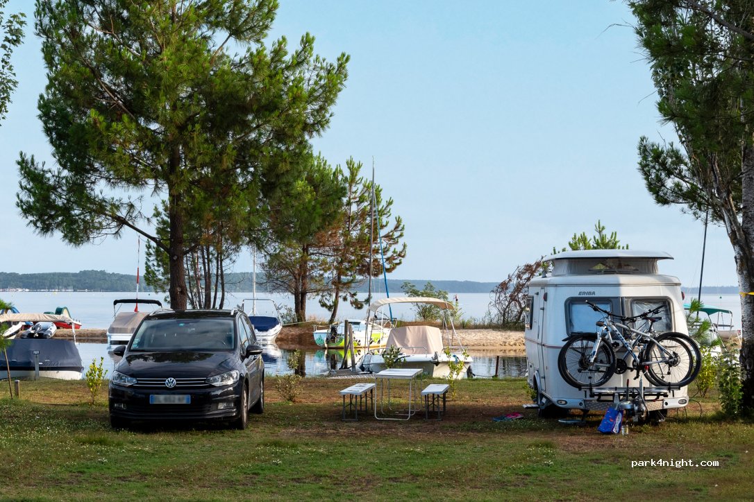 Superbe emplacement au bord du petit port et de la plage à l'ombre des pins. Super pour ceux qui font des sports nautiques sur lac. Camping très agréable sanitaires super propres et en plus nous avons profité d'un tarif promotionnel spécial van. Je recommande ce camping et reviendrai.