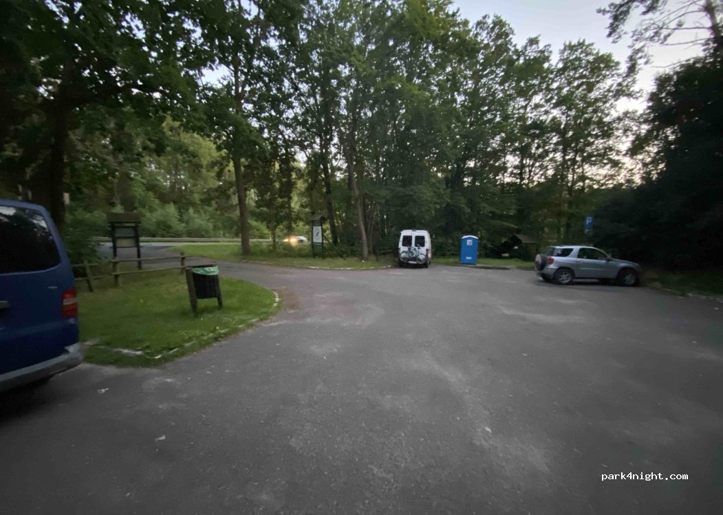 Parking dans la rue avec bancs de pique-nique couverts, poubelles et toilettes Dixi. Assez bruyant en journée car la rue est juste à côté. Nous ne sommes pas restés ici, mais cela devrait être possible sans aucun problème.