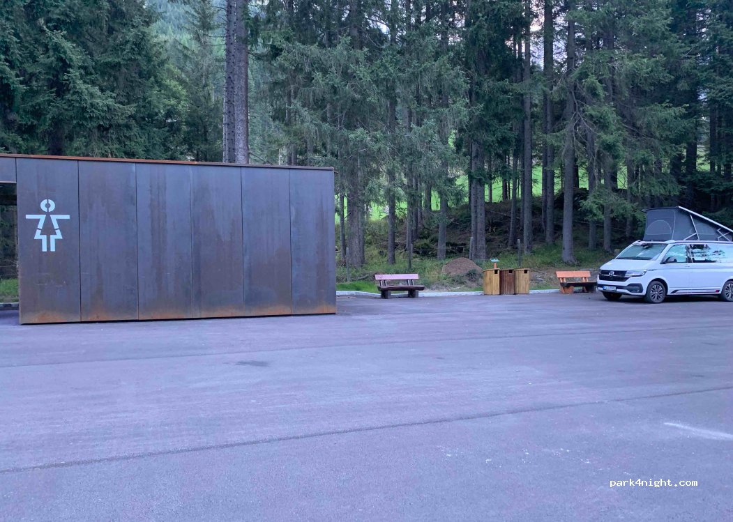 convenient spot before Matrei. Big space, we shared with several other campers with various vehicles. No sign prohibiting and clean toilets. Traffic gets noisy in the morning