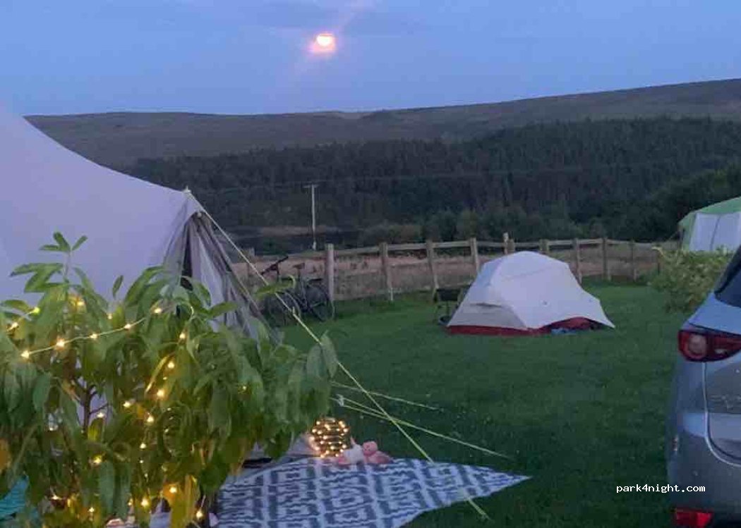 360 degrees views and clean facililities, really friendly owner. Says it is a membership campsite but I just called up and paid cash (or bank transfer) on arrival. Concrete blocks provided as field is on a slope. Hear the Curlew birds Would have been 5 stars but unfortunately not the most peaceful of campsites. Lots of screaming children until 10pm at night, and many loose dogs running around