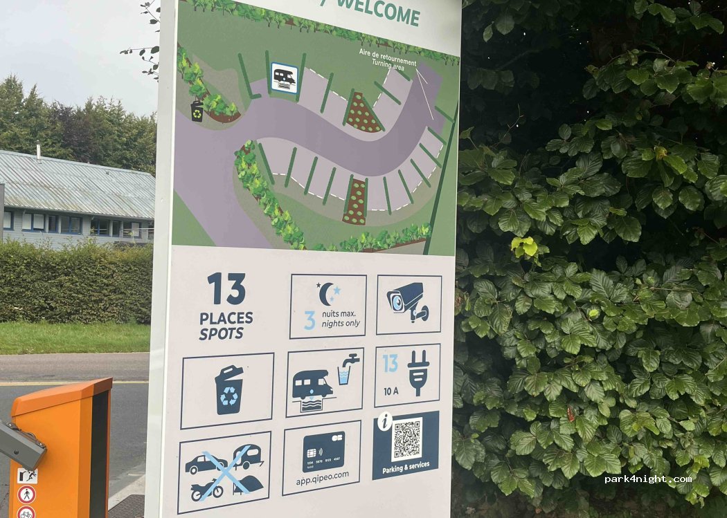 attention cette aire vas bientôt devenir payante à partir du 25 mai 2025 il commence s installé une barrière vraiment dommage parceque elle etaih gratuite avec électricité à cf jour il on coupé l'électricité mais vous pouvez venir pas encore payant pour le moment nuits très calme et possible de ce promener dans lf parc du château juste s côté