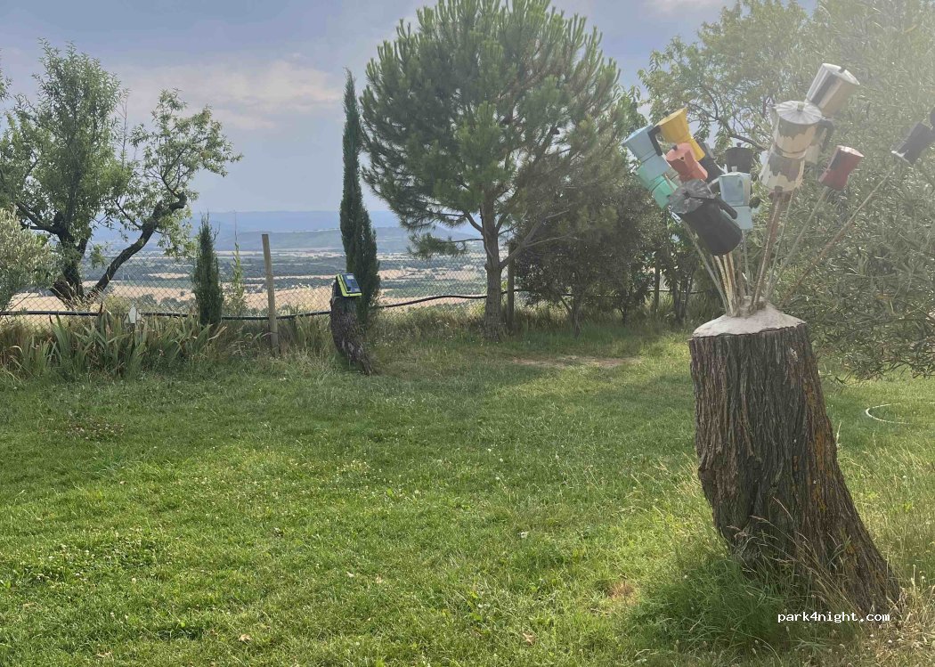 Camping met behoorlijk wat bomen en gras. Hierdoor redelijk wat schaduw. Prachtig uitzicht op kasteel en weidse vlakten in het zuiden. Wij betaalden 18 euro per nacht voor camper en 2 personen, zonder elektriciteit. Zwembad is niet groot, maar om af te koelen voldoet het prima.