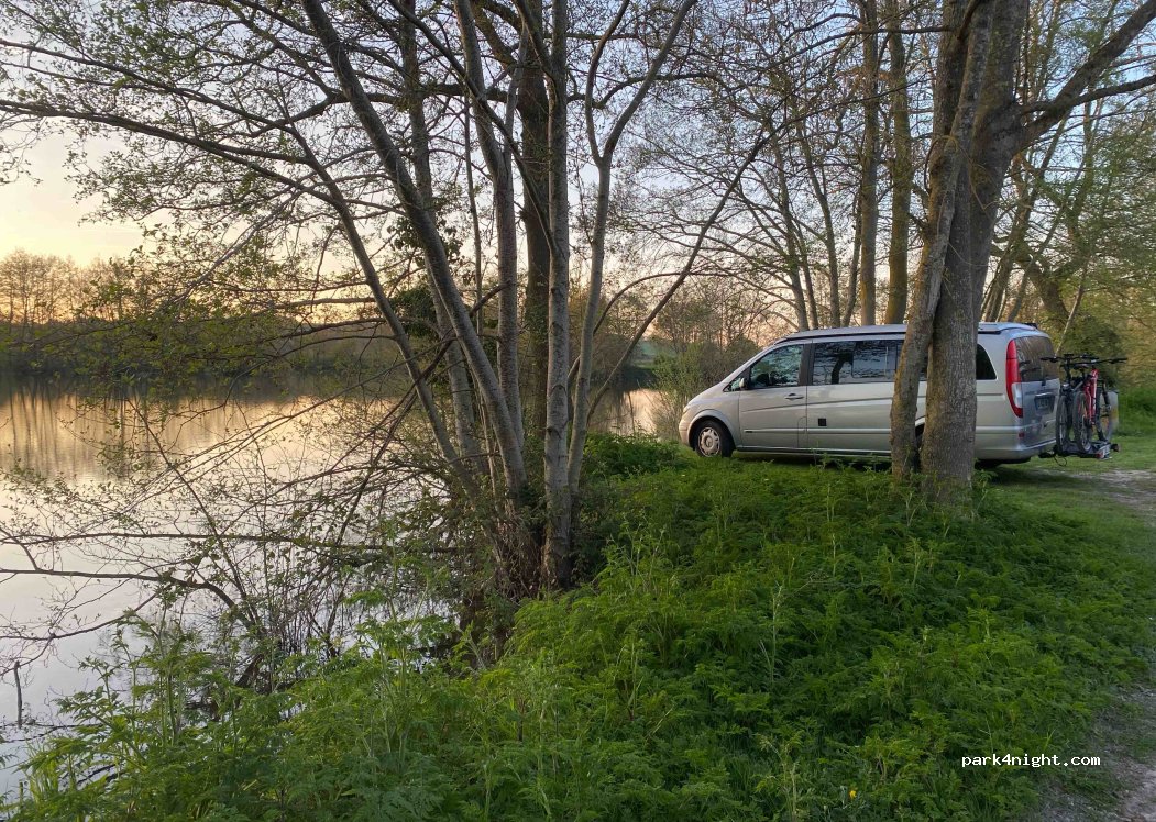 bel espace calme pouvant accueillir 5/6 camping car. Surtout garder de la place pour les véhicules des pêcheurs en bord de rive .laisser les pêcher..Boulangerie ,Supérette à 1.5 km par le chemin longeant l étang. Gardez cet espace propre.Avons passés 2 nuits tranquilles .