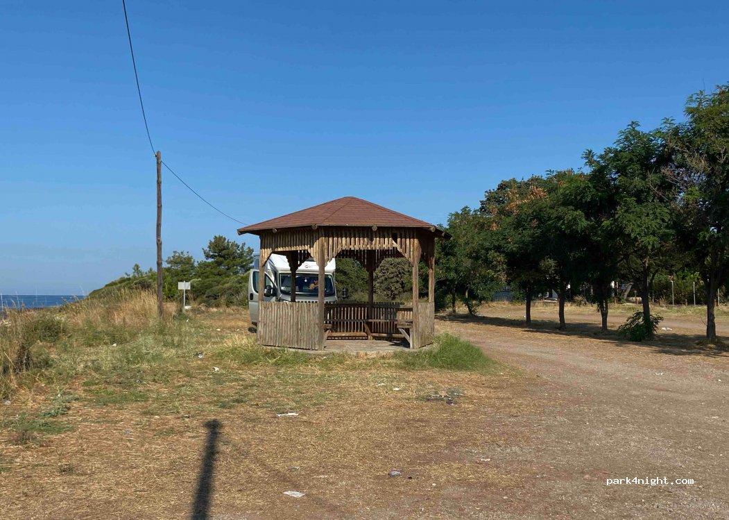 Petit parking en herbe à côté d’un kiosque, très calme juste au bord de la plage et de la mer. Très bien pour la nuit surtout s’il pleut, nous voulions allé au Park4Night plus loin mais celui-ci est impraticable s’il pleut.