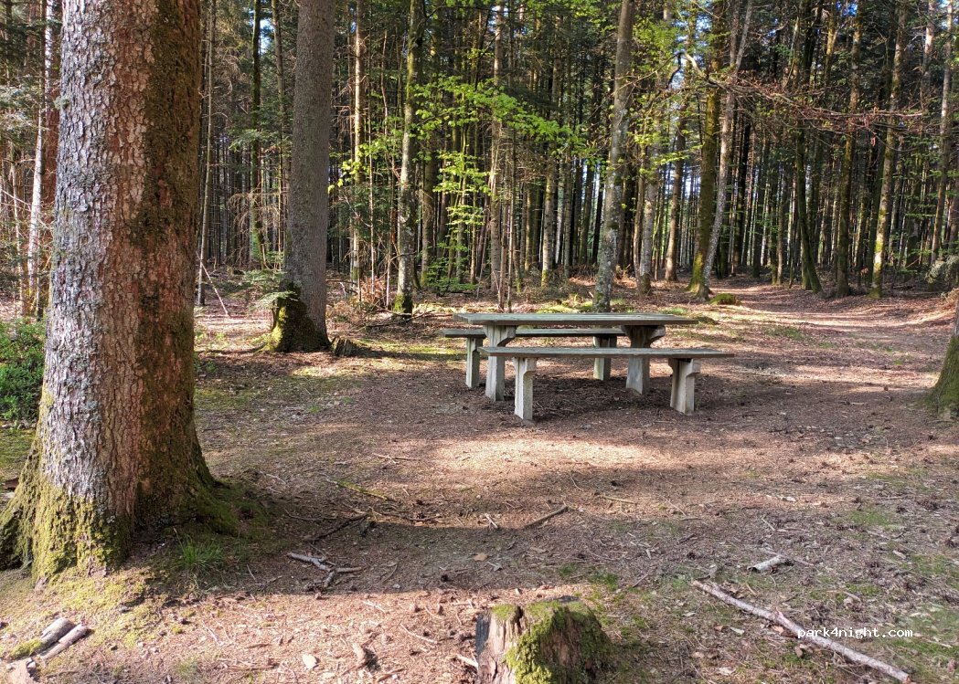 Kleine ruhige Ecke am Waldrand und in der Nähe einer Straße, die zu einem Weiler führt, daher wenig Verkehr. Platz für einen Kastenwagen oder Van, Picknicktisch direkt nebenan unter den Bäumen. Nachts sehr ruhig, ideal zum Schlafen in der Kühle. In den Schulferien ist in der Ferne ein Feriencamp zu hören. Bitte hinterlassen Sie den Platz sauber und nehmen Sie Ihren Abfall mit.