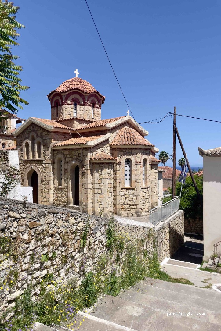 Camping très agréable hors saison, accueil sympa, wifi gratuit, 60 marches environs pour rejoindre la petite plage avec une eau transparente. Avec carte ACSI, 17 € pour le camping-car et 2 personnes. Sur le port, la première taverne "Parthénon" fait des menus à 10/12 € de bonne qualité traditionnelle.