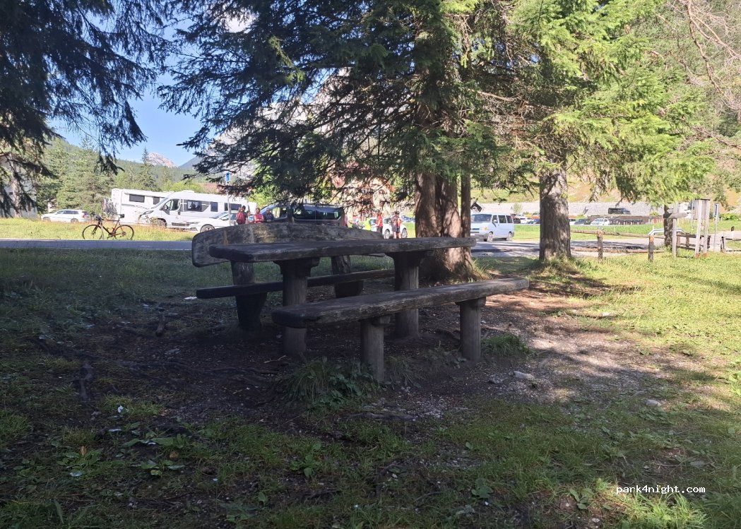 Parking on dirt but well leveled there are no prohibitions, it is on the Cortina Dobbiaco cycle path and next to the bus stop for Misurina and the three peaks of Lavaredo in front there is a picnic area with tables and baskets.