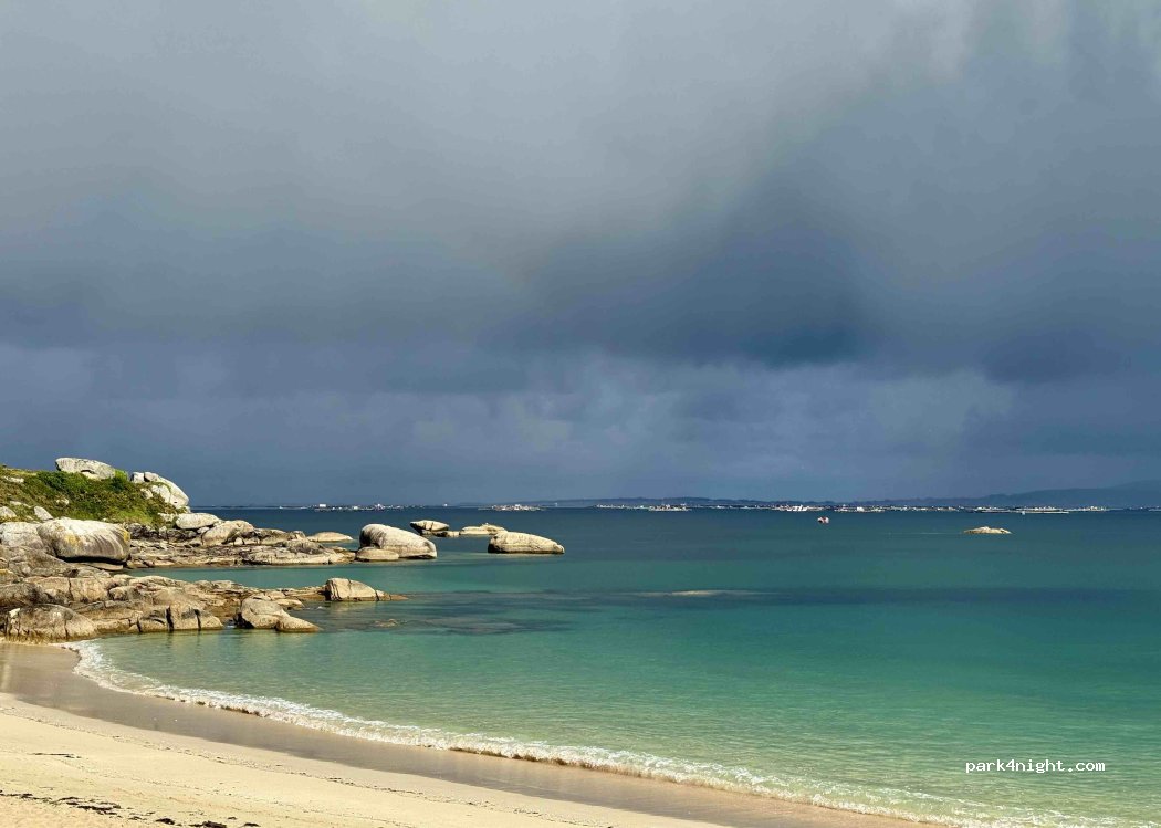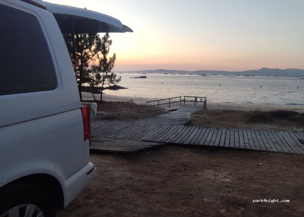 este lugar es una joya a cuidar! a pie de playa, de día no hay mucha intimidad, al atardecer tienes una caída de sol magnífica. la playa es pequeña y nos tocaron días sin movimiento casi de olas. queda cerca para ir a Portonovo y visitar las islas. Hay cubos de basura y un chiringuito que cocina muy rico y te deja cargar la batería si lo necesitas. porfavor gestionar bien sus residuos sanitarios